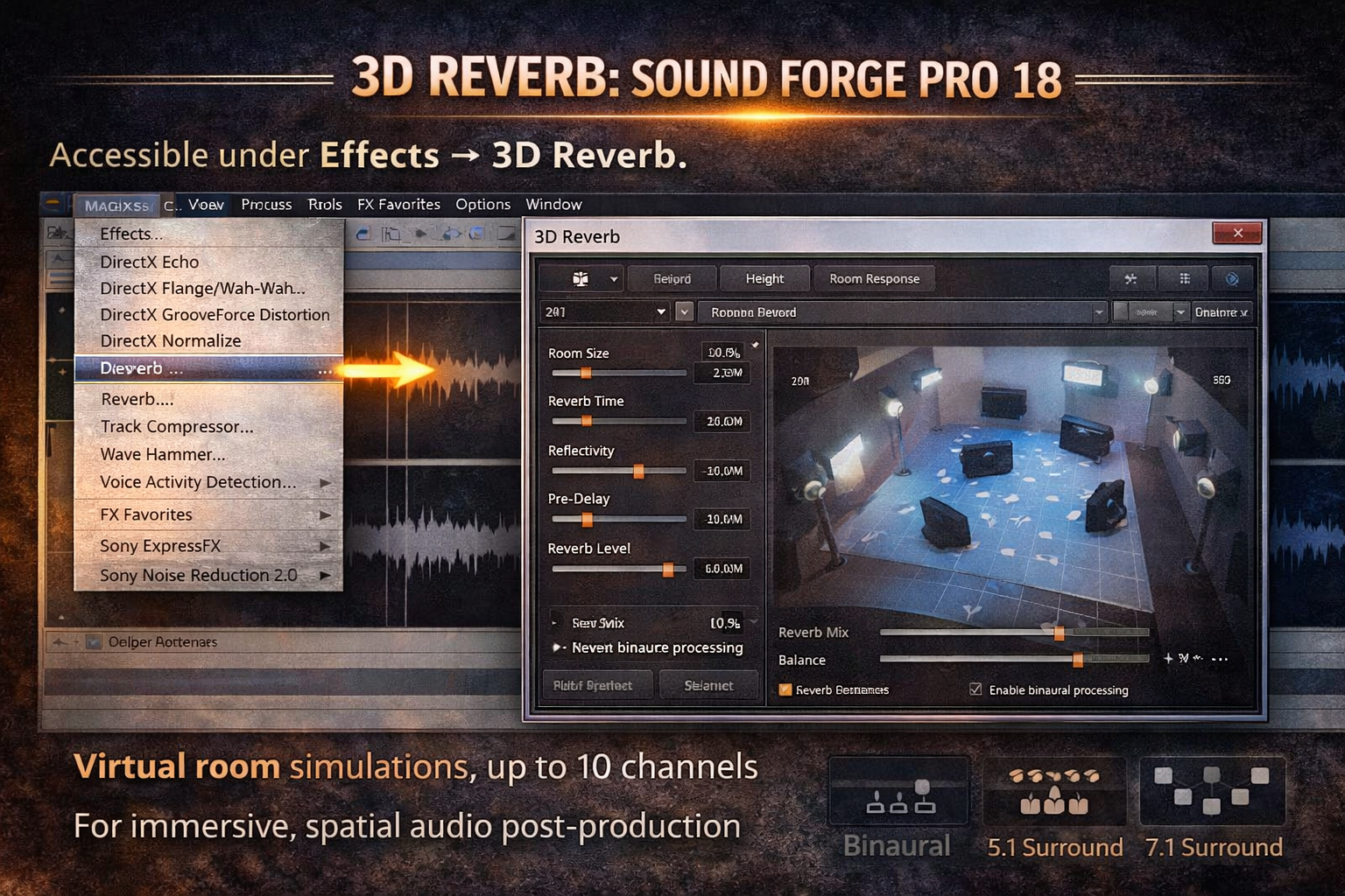 Sound Forge Pro 18 added a 3D Reverb FX feature that moves beyond stereo reverb — it creates virtual room simulations that can extend to up to 10 channels, useful for immersive audio work and spatial sound design. It's accessible under the Effects menu in SF Pro 18 and later. Full specs for the current version are on the Sound Forge product page.
