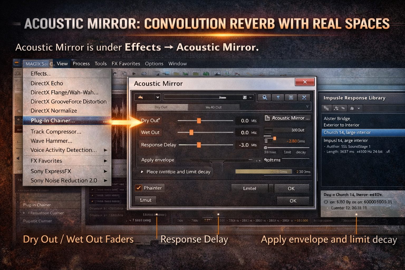 Acoustic Mirror is under Effects → Acoustic Mirror, or accessible through the Plug-In Chainer. It's a convolution reverb engine — instead of algorithmically simulating a space, it uses impulse responses (.sfi files or standard .wav files) to reproduce the actual acoustic characteristics of recorded real spaces. Sound Forge ships with a library of impulse responses: concert halls, churches, studios, bridges, tunnels, and other environments. Sound On Sound's review of Sound Forge v8 describes Acoustic Mirror as one of the first professional convolution reverb implementations in a PC audio editor — it's been in Sound Forge longer than most reverb plugins have existed.