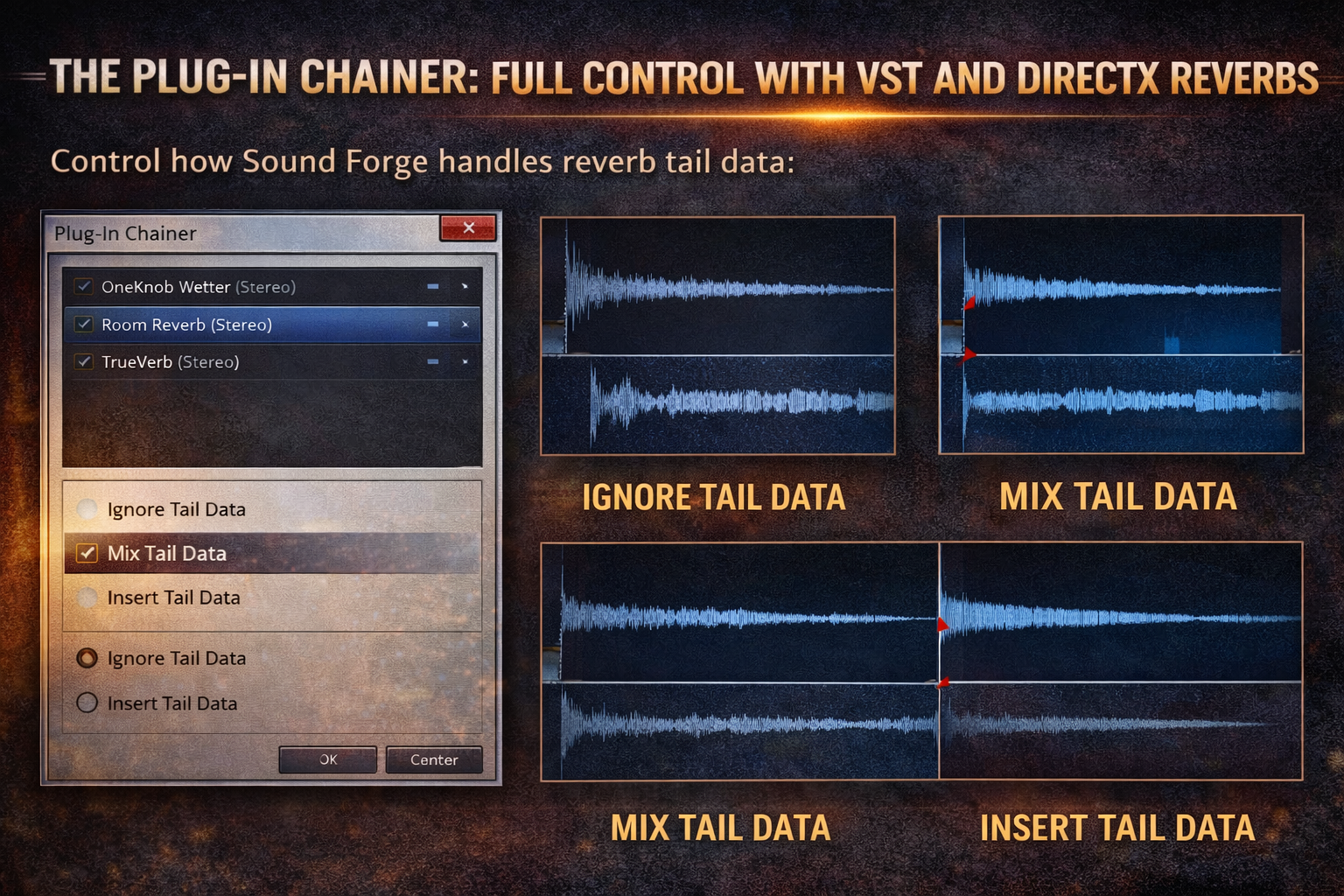 Tail data is the reverb decay that continues after the source audio ends. In the Plug-In Chainer, you choose how Sound Forge handles it: Ignore Tail Data cuts the reverb off abruptly (rarely sounds natural), Mix Tail Data blends the decay into the audio that follows (the right choice for most work), Insert Tail Data extends the file length to include the full decay. Always check this setting before applying reverb — the default may not match what you need.