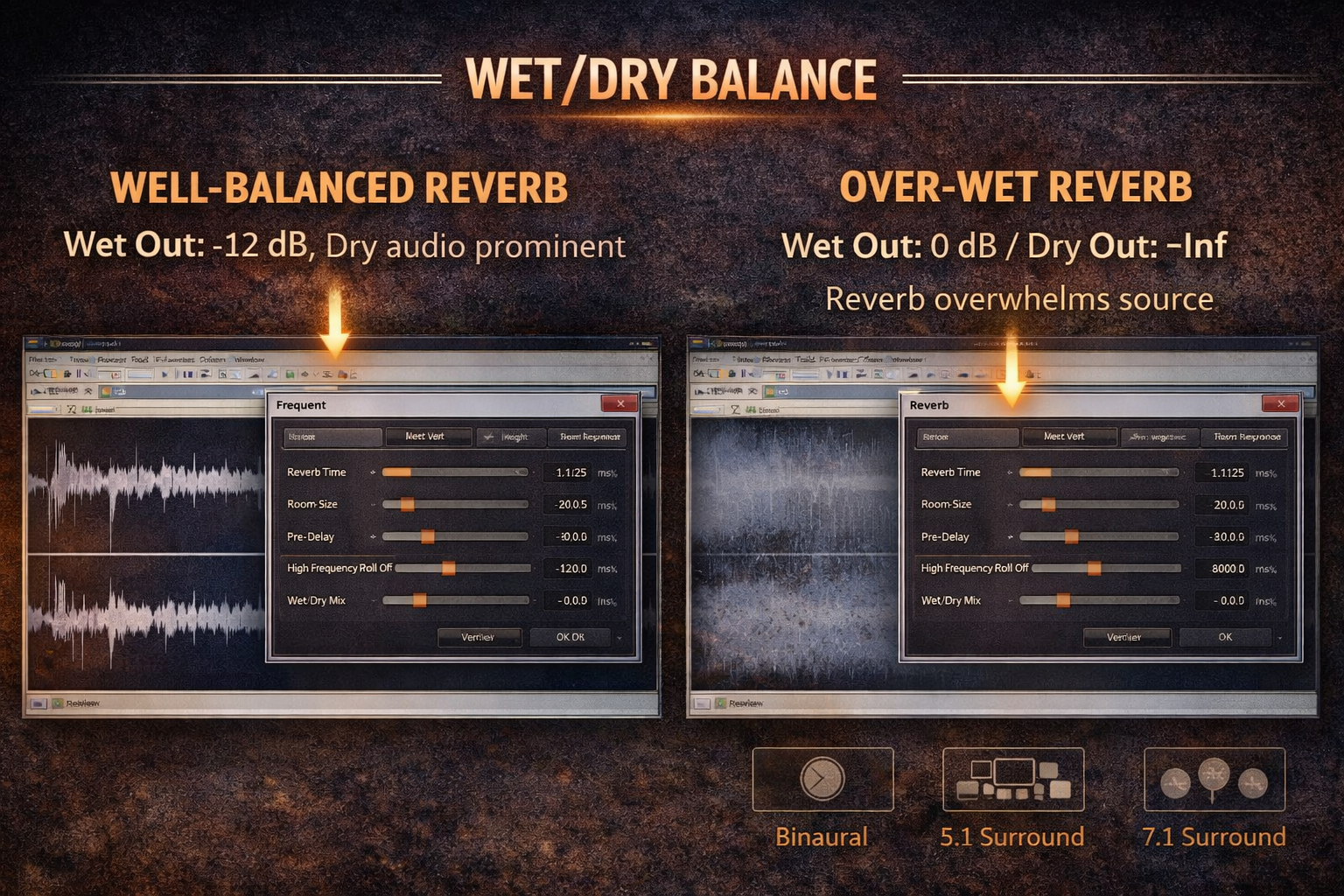 The most consistent mistake across all three reverb methods is setting the wet signal too high. 100% wet — only the reverb output, no dry signal — is appropriate for creating a reverb return in a DAW mix where you're routing audio to an aux send and the source track provides the dry signal. Applied directly to a file in a destructive editor with Dry Out at -Inf, the result is a file that sounds like the source was recorded inside the reverb, not placed in front of it.