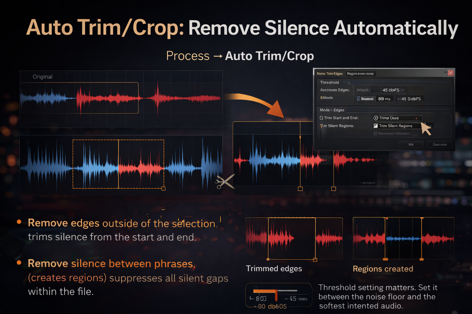 Manual Trim/Crop works well when you can hear and see the useful content clearly. When you're processing a batch of recordings with inconsistent amounts of lead-in silence — digitized tapes, captured streams, field recordings — Auto Trim/Crop handles the trimming automatically based on a signal threshold.