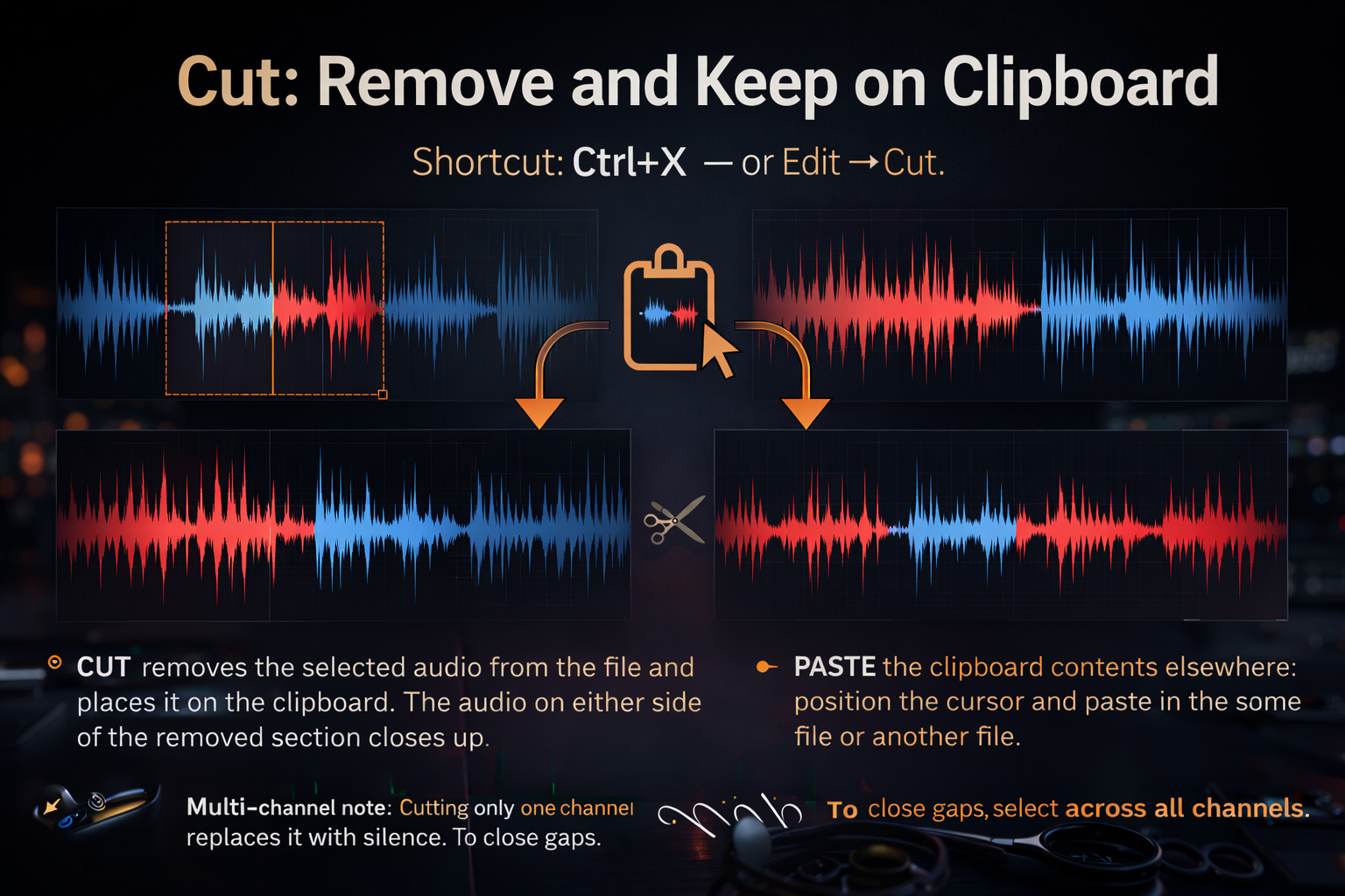 Cut (Ctrl+X) removes the selected region and places it on the clipboard — the file gets shorter where you made the cut. Trim/Crop (Ctrl+T) does the opposite: it keeps only the selected region and removes everything outside it. Cut is for removing a section from the middle; Trim/Crop is for isolating a section by discarding the surrounding audio.