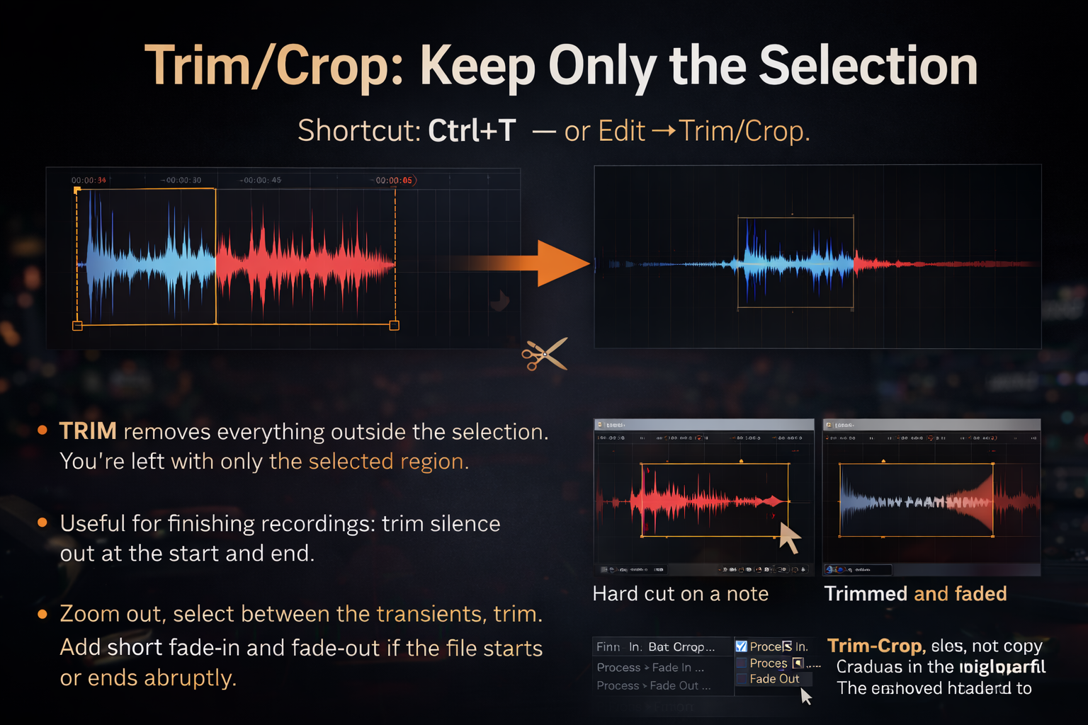 This is the most common trimming operation for finishing a recording. You've captured a take, there's silence or noise at the beginning and end, you select the usable audio, and Ctrl+T crops the file to exactly that selection. The result is a file that starts and ends exactly where your selection did.
