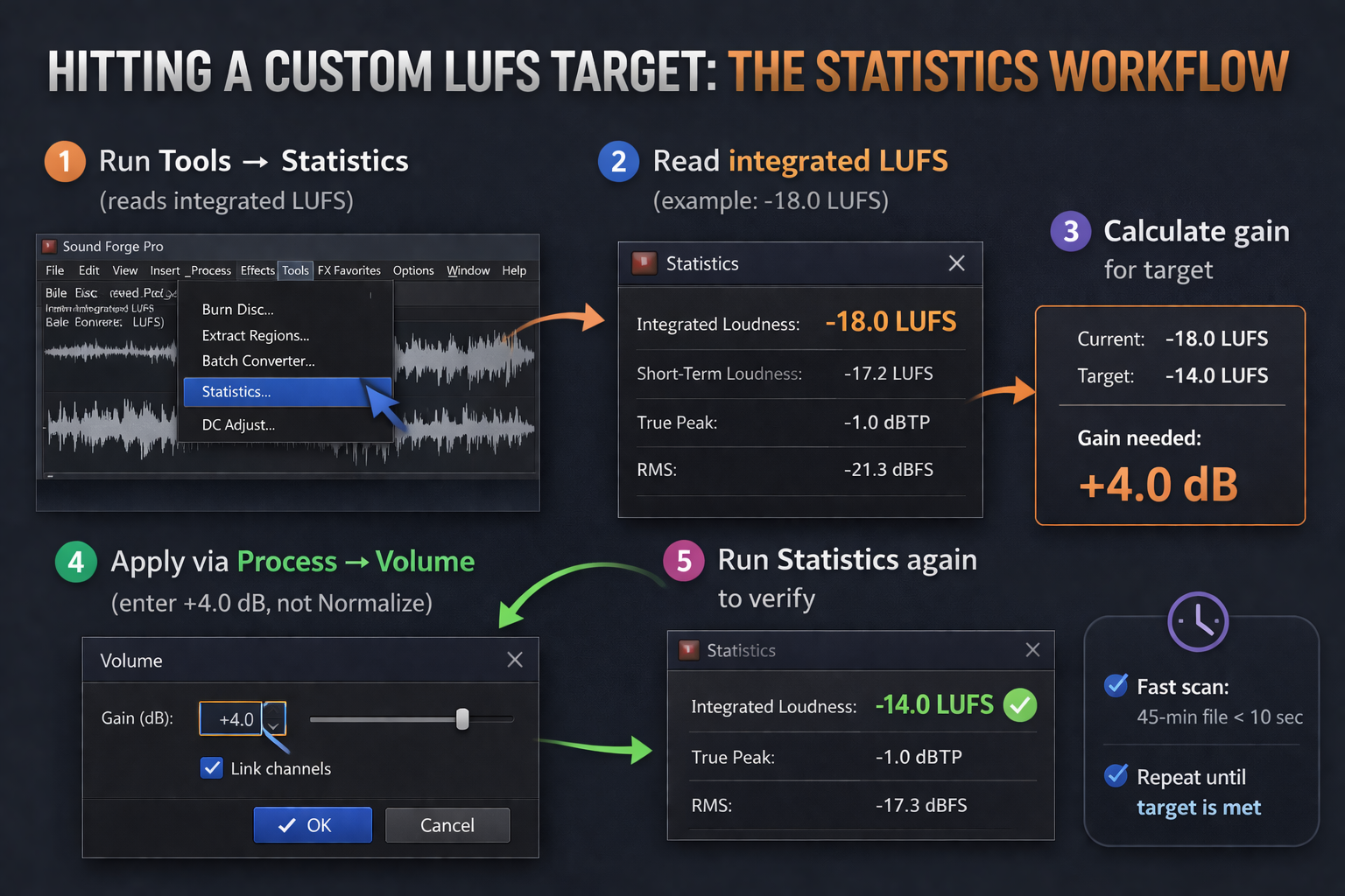One thing the Statistics process won't do: it doesn't adjust the file. It only reads. You have to apply the gain separately and re-verify. But the readout is fast — a 45-minute podcast file scans in under 10 seconds rather than real-time playback, which matters when you're doing this across a run of files.