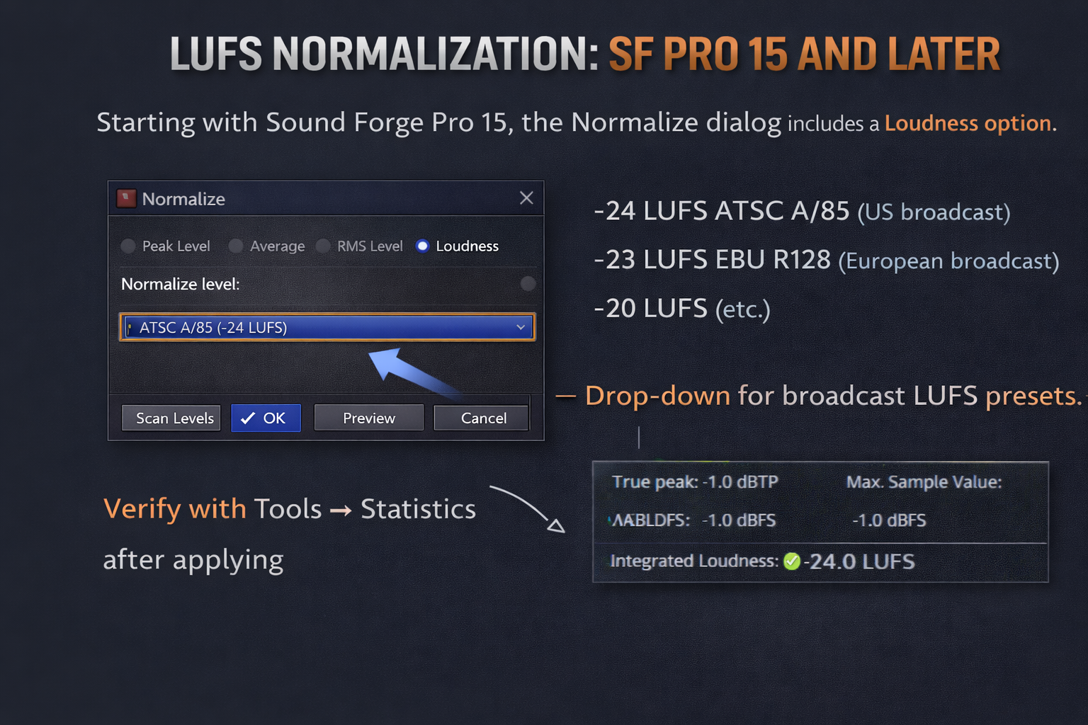 Starting with Sound Forge Pro 15, the Normalize dialog includes a Loudness option. This applies integrated LUFS normalization to presets: ATSC A/85 (-24 LUFS, US broadcast standard), EBU R128 (-23 LUFS, European broadcast), and a few others in the -20 to -25 LUFS range. There is no field for a custom streaming target like -14 LUFS (Spotify/Apple Music) or -16 LUFS (YouTube) — those require the trial-and-error workflow described below.