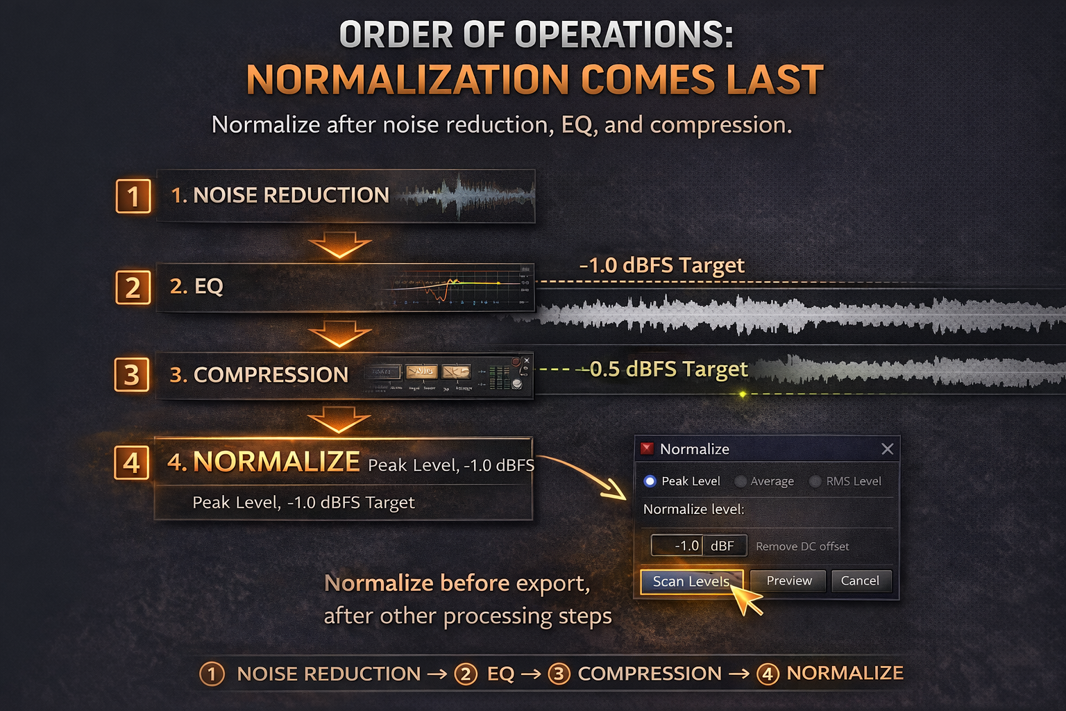 Normalization is the last processing step before export. Run it after noise reduction, EQ, compression, and any other processing. Normalizing first and then running noise reduction or effects can introduce peaks above your normalized ceiling — the effects can raise levels beyond what you set. More importantly, noise reduction gets a better noise print on an un-boosted file, and EQ and compression make better decisions when the signal hasn't been artificially raised yet.