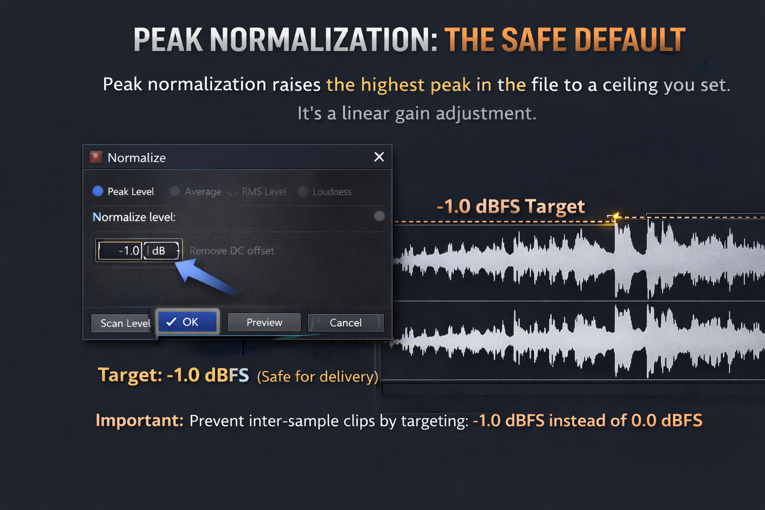 Select Peak Level, set the target, click Scan Levels, preview, click OK. For most delivery purposes -1.0 dBFS is the standard target, not 0 dBFS. The reason is inter-sample peaks — when a 0 dBFS digital file gets decoded or transcoded, the D/A converter can produce analog peaks slightly above 0, causing audible clipping on some playback systems. -1.0 dBFS gives one dB of headroom against this. For MP3 or AAC exports specifically, -1.0 to -0.5 dBFS is standard — lossy encoding can push peaks above 0 even from a clean source. The MP3 export guide covers why this matters at the encoding stage.