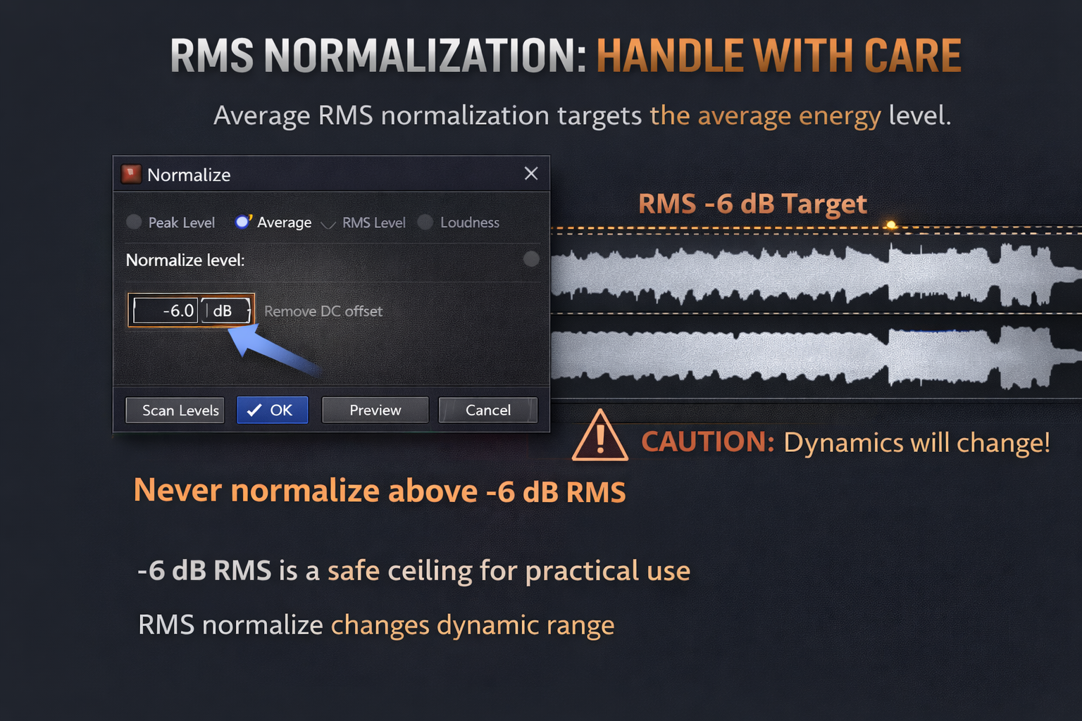 For practical use: if you're matching levels across a batch of voice recordings where consistent perceived loudness matters more than absolute peaks, RMS at -18 to -23 dB is a reasonable range. Click Scan Levels first so you can see the current RMS value, then set your target relative to it. Preview before applying — the difference between RMS at -18 dB and -12 dB on a voice recording is audible and not subtle.