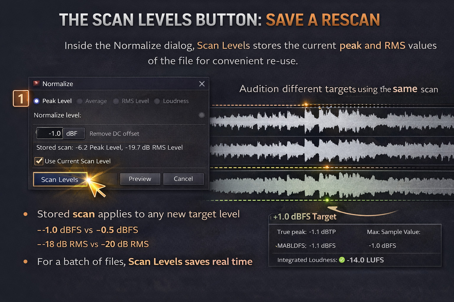 Inside the Normalize dialog, Scan Levels stores the current peak and RMS values of the file. Once you've scanned, you can change the target value and preview at the new level without rescanning. The stored scan applies to any new target you set via the Use Current Scan Level checkbox.
