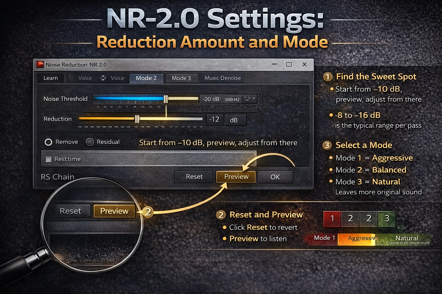 Start at -10 to -12 dB reduction with Mode 3 in NR-2.0. Preview before applying. If you still hear too much noise, try a second pass rather than pushing the first pass higher. Most recordings sound best with the noise reduced to inaudible, not to zero — the treatment artifacts at the extremes are more distracting than moderate room tone.