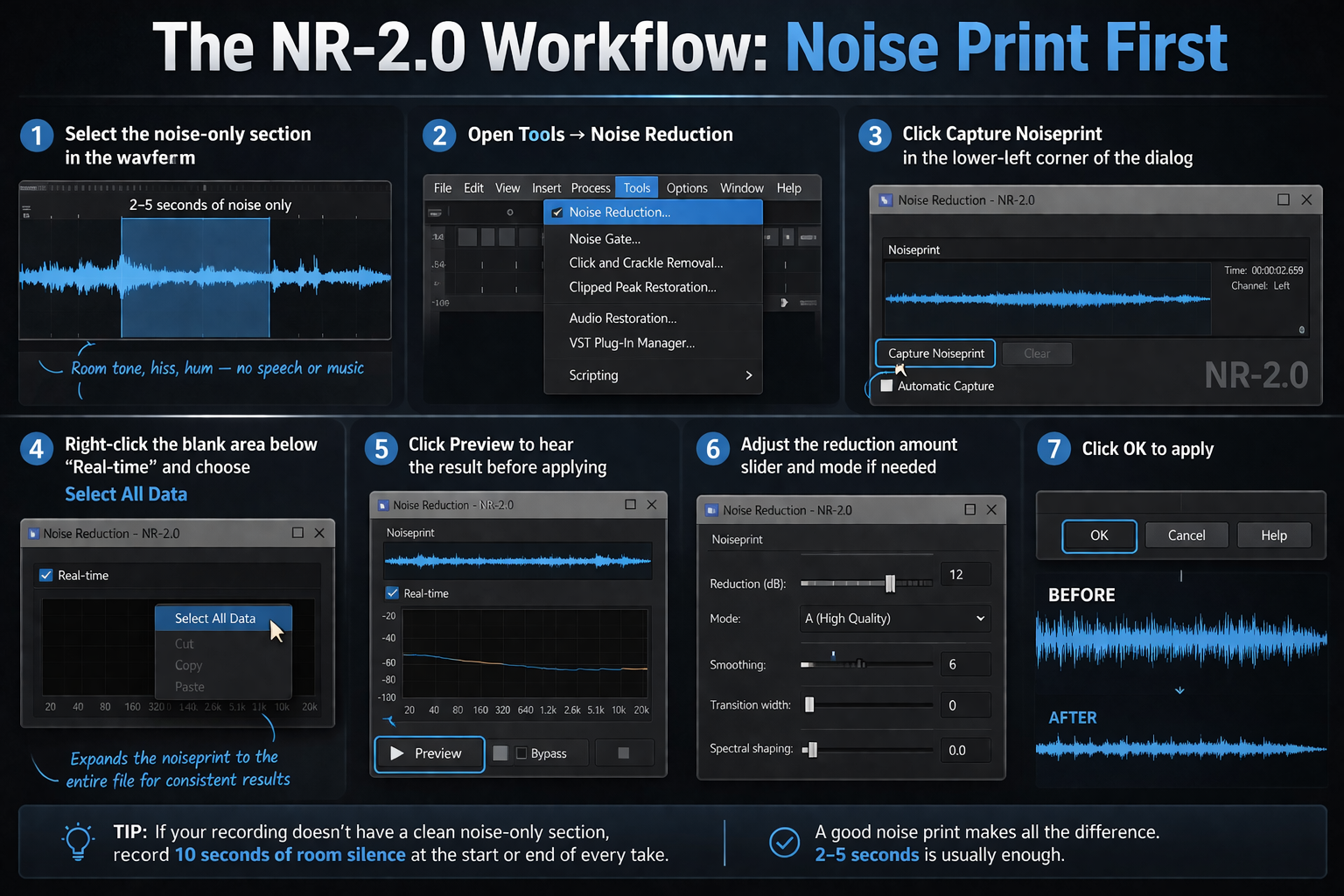 The quality of the noise print makes or breaks the result. You need a section of audio that contains only the noise you want to remove — room tone, HVAC hum, tape hiss — with no speech, music, or other content mixed in. Two to five seconds is enough. If your recording doesn't have a clean noise-only section, always record one at the start or end of every take before you start speaking or playing — the recording guide covers why this matters at the capture stage. Ten seconds of room silence at the top of a session takes no time and has saved more than a few recordings I'd otherwise have had to re-do.