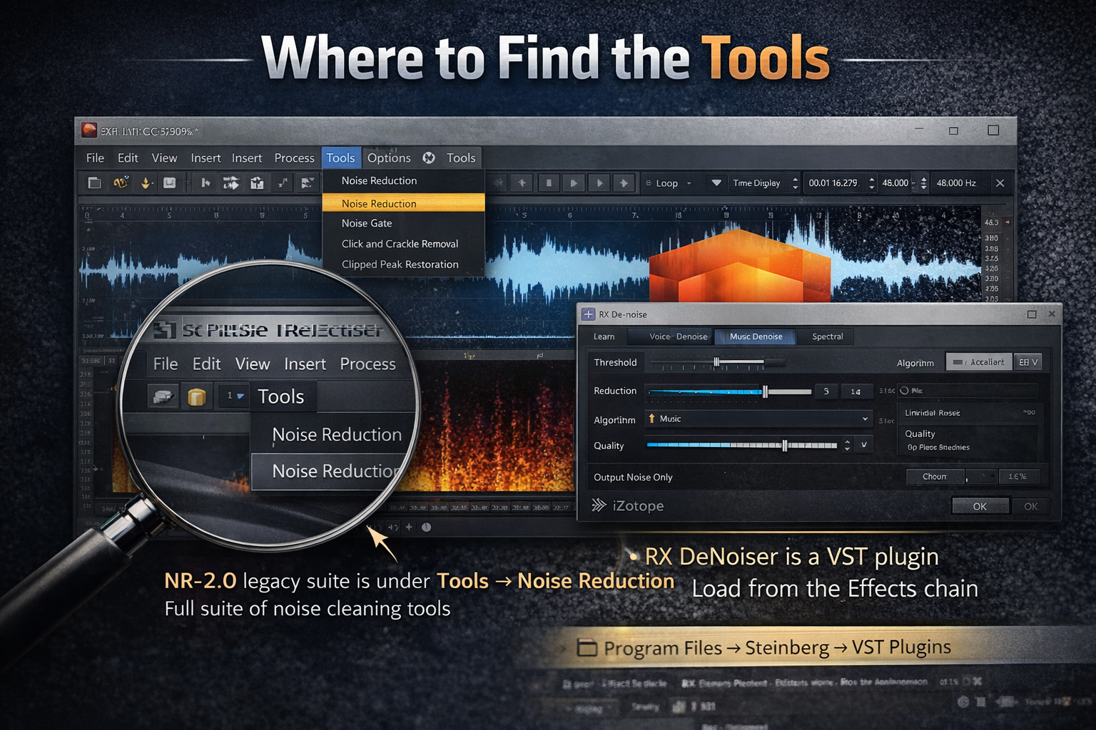 Tools → Noise Reduction. Not under Effects, not under Audio Restoration — specifically under the Tools menu. The iZotope RX DeNoiser is a separate VST plugin loaded through the Effects chain or Plug-In Chainer.