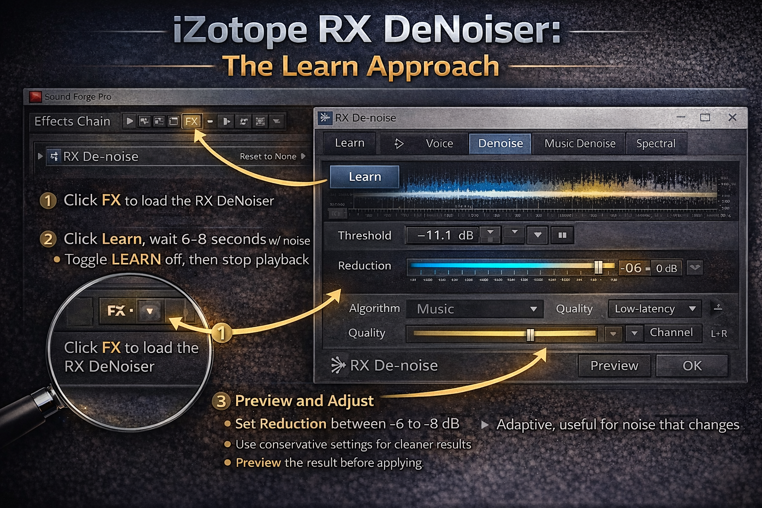 Load the RX DeNoiser through the Effects chain or plug-in chainer. Hit Learn, play a few seconds of noise-only audio (or let it run from the start if the first section is clean noise), then stop. Toggle Learn off. Preview the result with your reduction amount set conservatively — start around 6–8 dB here too, for the same reason. The RX algorithm sounds cleaner at moderate settings than NR-2.0 for most broadband noise, but it's not immune to artifacts at high reduction amounts. iZotope's own RX Elements tips guide covers the Learn workflow in detail.