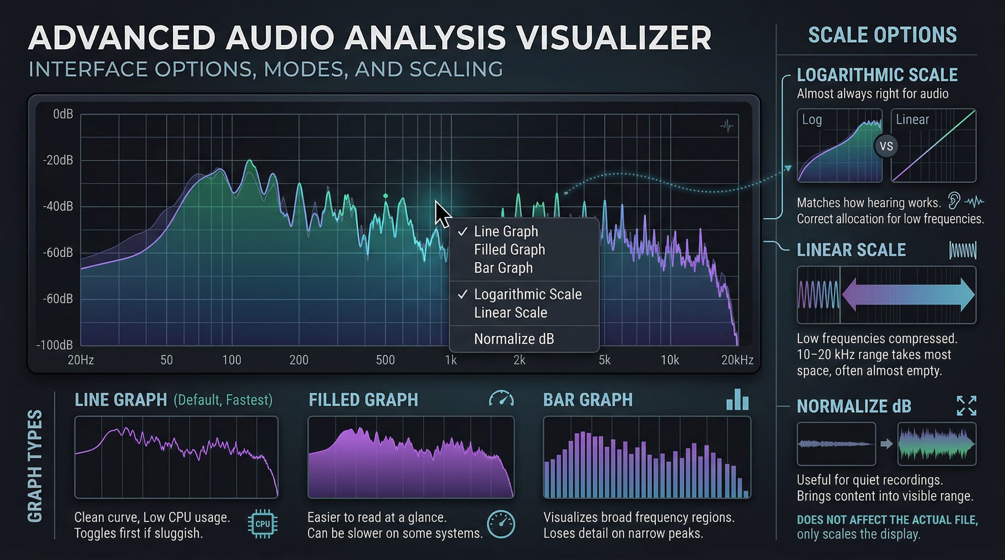 Line Graph is the default and fastest — clean frequency curve, low CPU. Filled Graph fills the area under the curve, easier to read at a glance but slower on some systems. Bar Graph shows frequency as discrete vertical bars — good for visualizing broad frequency regions but loses detail on narrow peaks. If the display feels sluggish, switch to Line Graph first.
