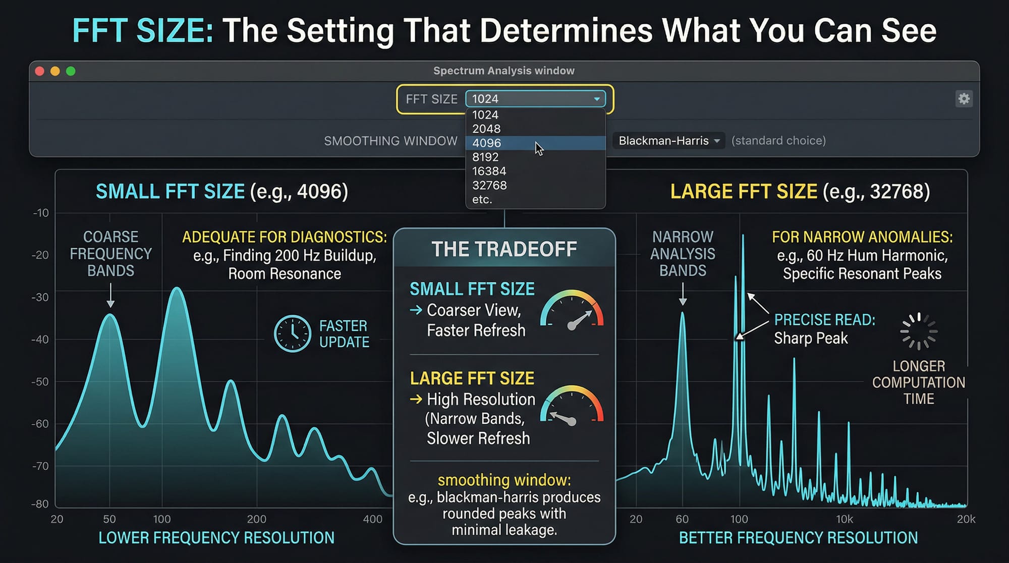 For most diagnostic work — finding a buildup at 200 Hz, identifying a resonance in a room recording — FFT size 4096 or 8192 gives adequate resolution without sluggish display. For hunting narrow anomalies like a 60 Hz hum harmonic or a specific resonant peak in a mastered file, push it to 16384 or 32768. At those sizes the peaks become sharp enough to read precisely. The tradeoff is that the display takes longer to compute, so if you're refreshing frequently it gets slow. A practical breakdown of FFT size tradeoffs in audio work is in this Harmony Central guide on spectrum analysis.