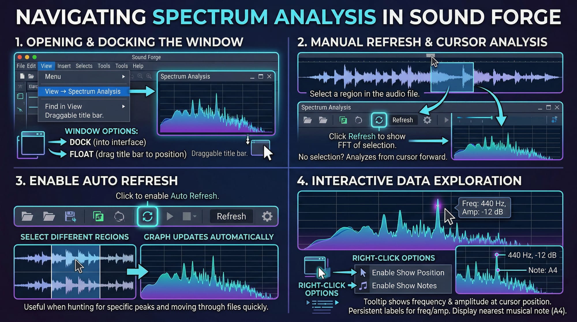 Go to View → Spectrum Analysis. The window docks into the Sound Forge interface or floats — drag the title bar to position it. It doesn't update automatically until you tell it to.