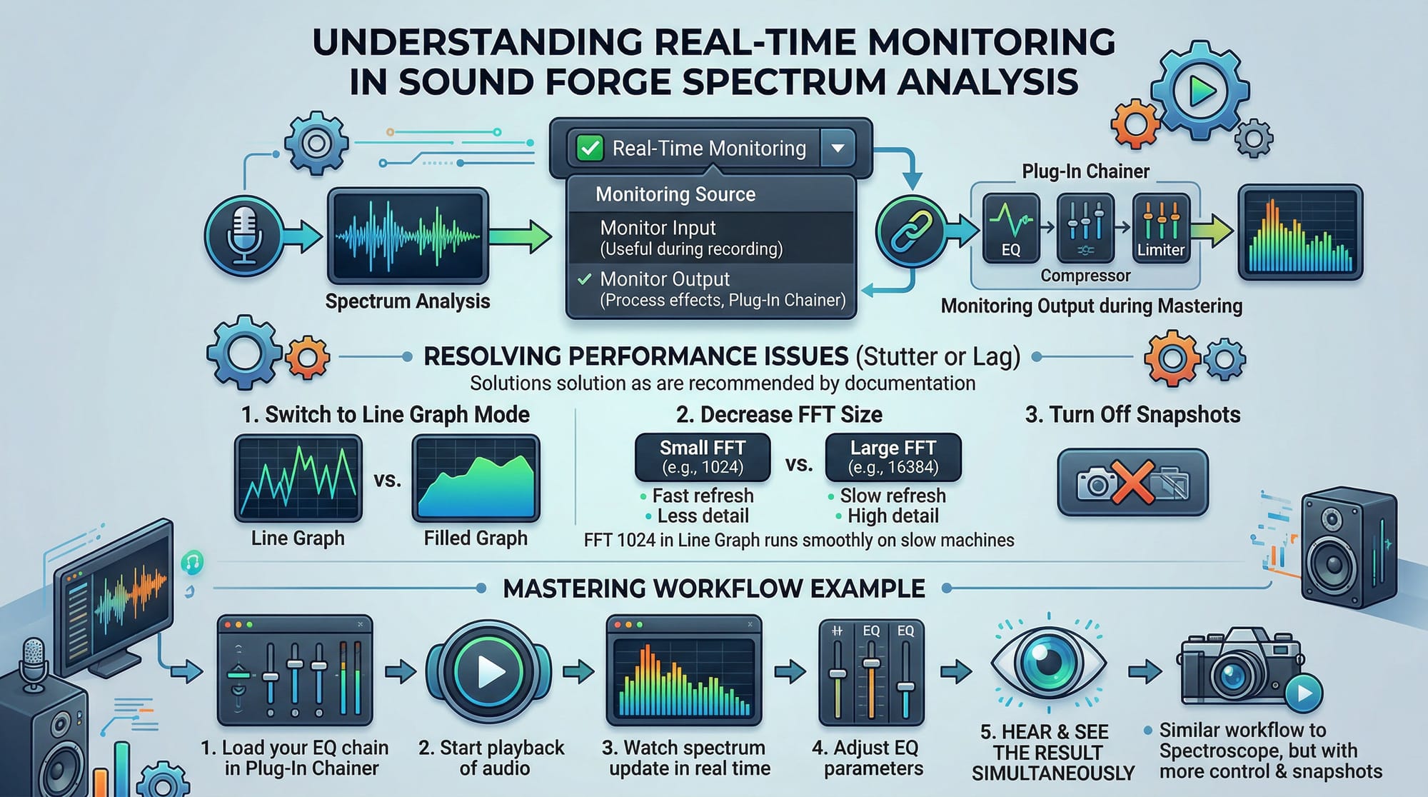 Real-time spectrum analysis is CPU-intensive. Three things that help: switch from Filled Graph to Line Graph display mode, decrease FFT size to 2048 or 1024, and turn off stored snapshots. If you're using real-time monitoring during playback, these three changes together usually resolve the lag. On older hardware, running Spectrum Analysis as a static refresh (no real-time monitoring) avoids the issue entirely.