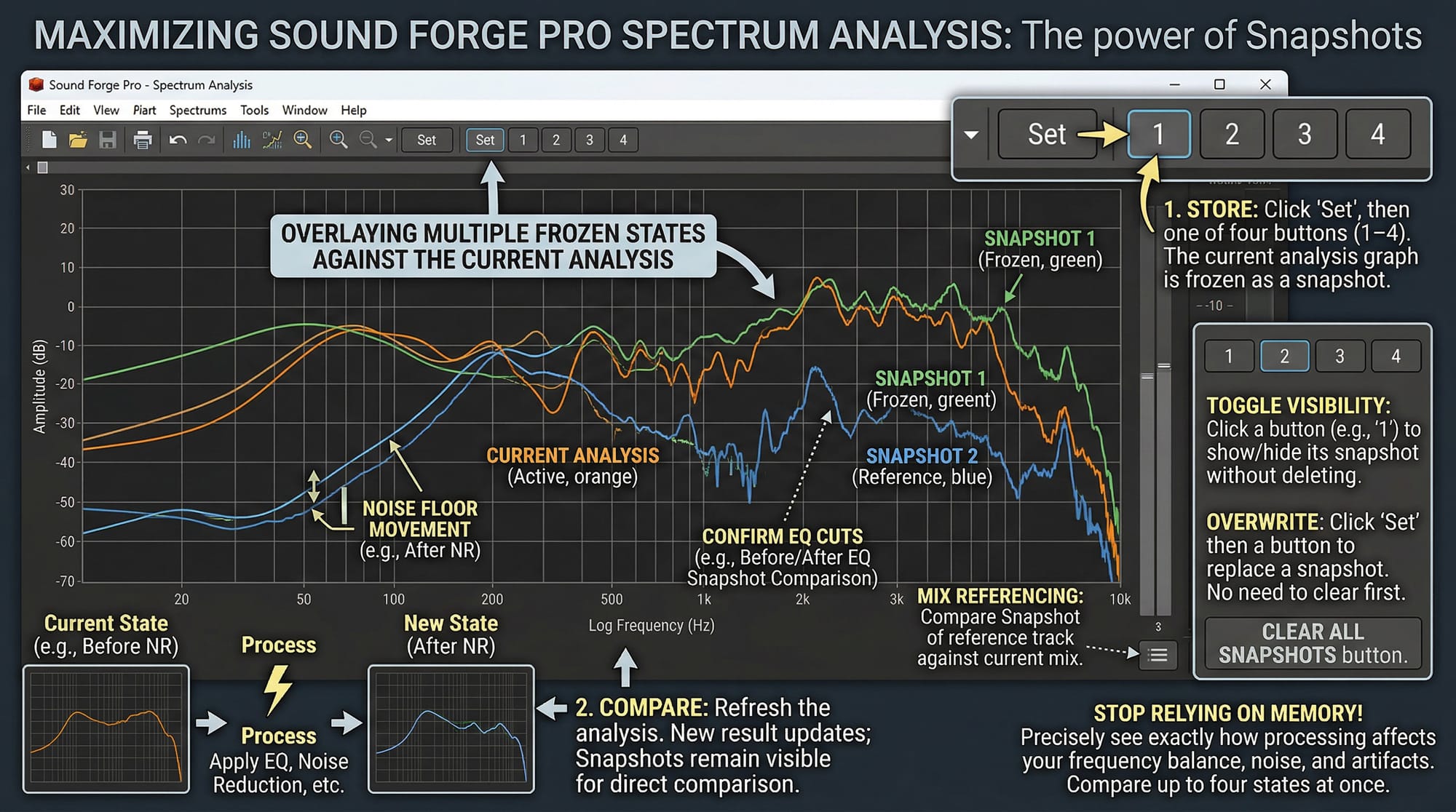 Sound Forge Pro's Spectrum Analysis stores up to four snapshots — frozen graphs you can overlay on the current analysis. Without this, you're relying on memory to compare what the frequency balance looked like before and after a processing step.