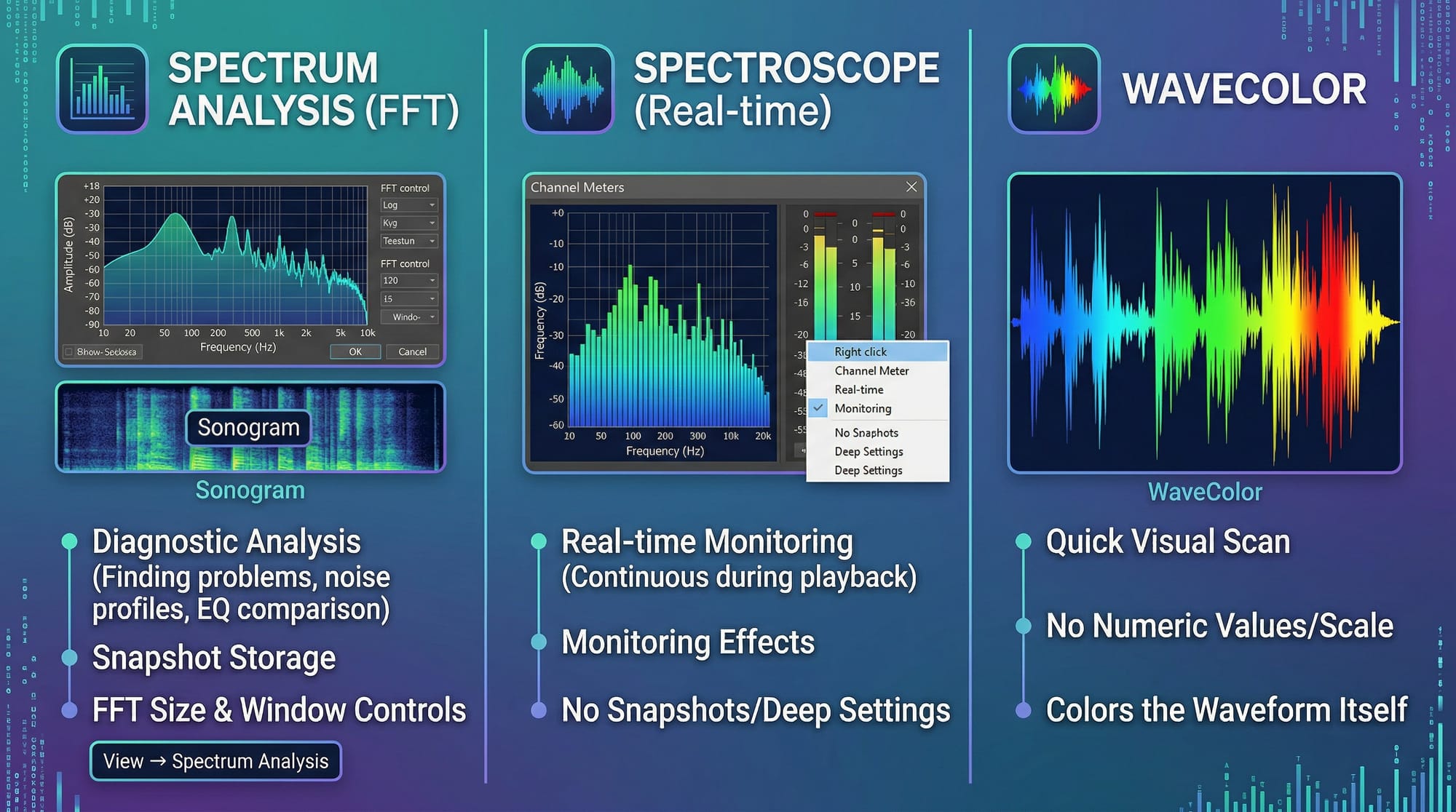 The article covers Spectrum Analysis specifically — the one with FFT controls and sonogram mode. On a vinyl restoration session last autumn I had all three open at once: WaveColor to spot where the crackle events were dense, Spectroscope to watch the noise floor in real time while NR was running, and Spectrum Analysis to compare snapshots before and after each pass. Each tool gave me something the other two didn't.