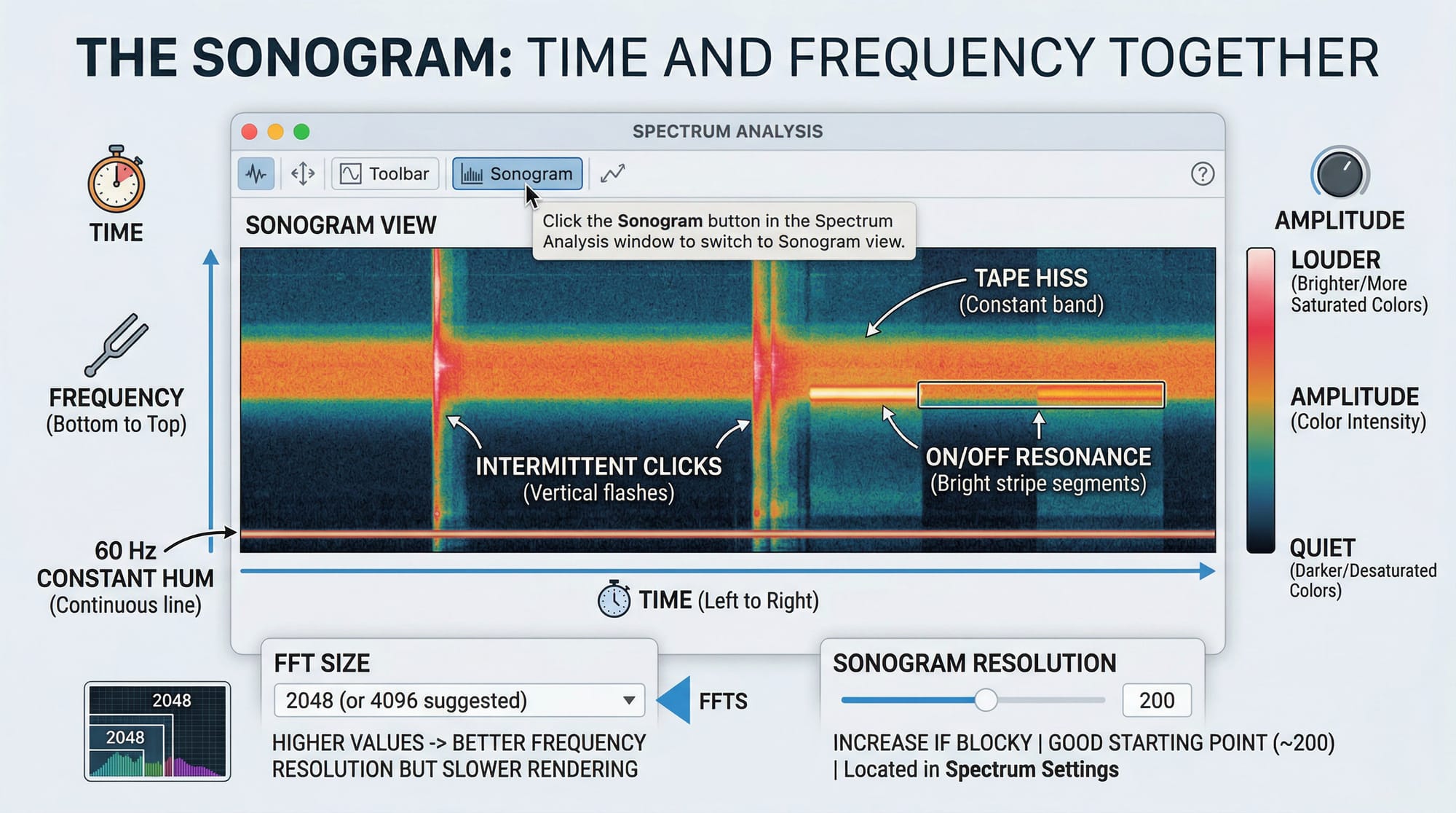 The sonogram makes time-varying frequency content visible in a way the standard spectrum graph can't. A 60 Hz hum that's constant shows as a continuous horizontal line at the bottom. An intermittent click appears as a vertical flash across all frequencies. Tape hiss appears as a constant mid-to-high frequency band. A resonance that only appears during certain passages shows as a bright horizontal stripe that turns on and off.